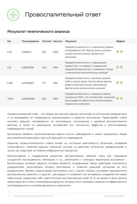 Результаты теста позволяют получить не только рекомендации по профилактическому лечению, но и по схеме питания, ведь оно играет важную роль в поддержании здоровья. Изменение в питании способно существенно уменьшить факторы риска при подверженности аллергическим реакциям или инфекционным заболеваниям.